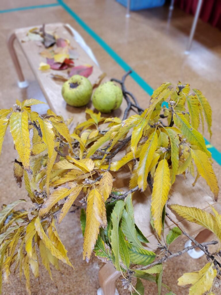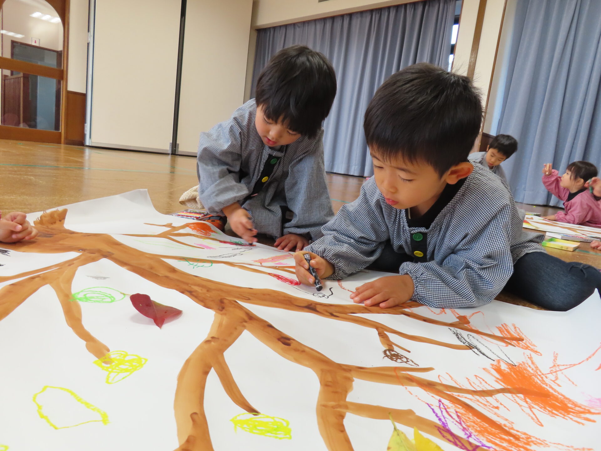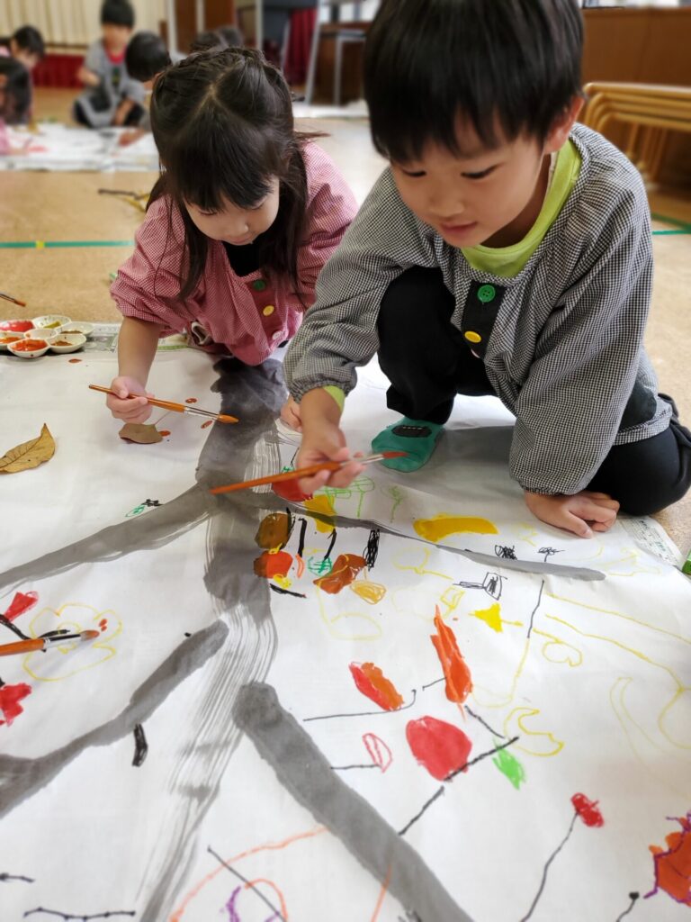 グループで大きな木に葉っぱや木の実など、思い思いに描きました。綺麗に色づいた秋の葉っぱの作品が出来上がりました。