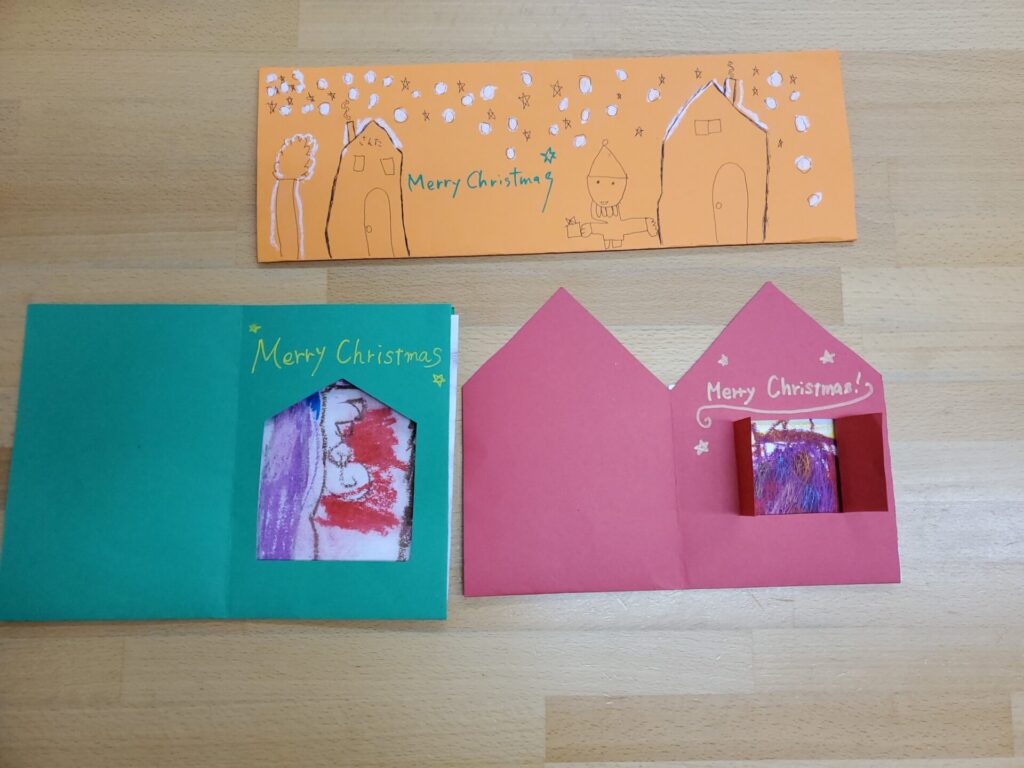 スクラッチをしたりサンタクロースの絵を描いたりしてカードを作りました。