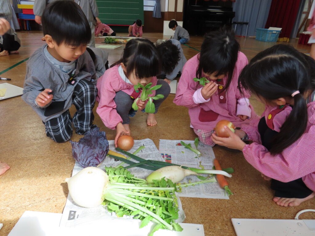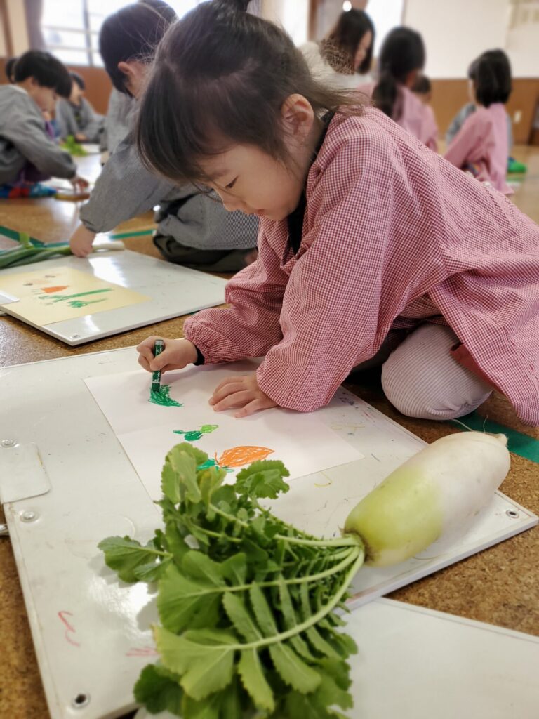 野菜の色や葉っぱの形の面白さなど、色々な発見をした一枚になりました。