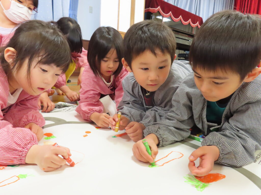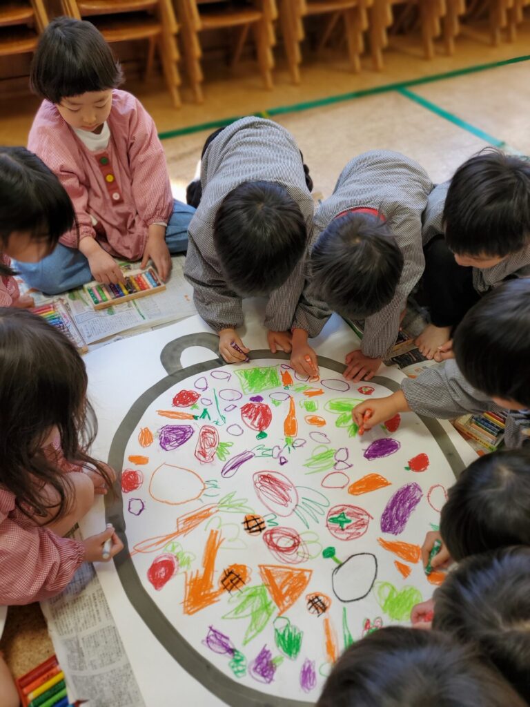 グループで大きなお鍋にたくさんの野菜を描きました。みんなで好きな野菜を描いて美味しそうなスープになりました。
